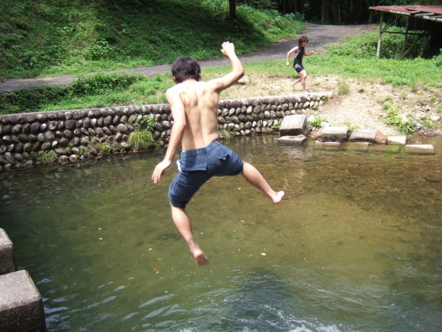 バーベキュー後近くの川で水遊び